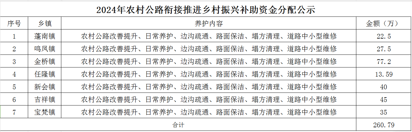 蓬溪县2024年农村公路衔接推进乡村振兴补助资金分配公告