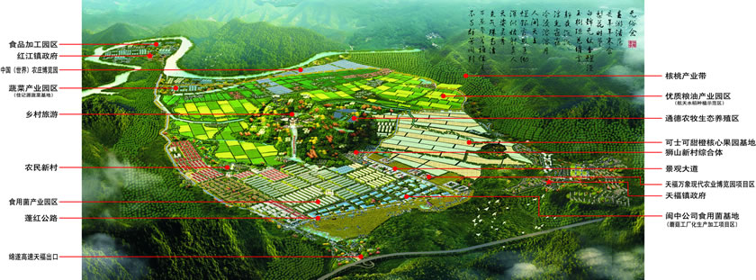 四川省绿然现代农业科技有限责任公司于2014年入驻蓬溪现代农业示范区,建设“中国智慧农庄体验园”项目,项目选址红江镇红江村、部营村、白坪村,占地面积4000余亩,计划总投资5亿元,历时3年建成集现代农业生产、科普教育、素质拓展、休闲观光、养生五大功能板块于一体的产业园区。