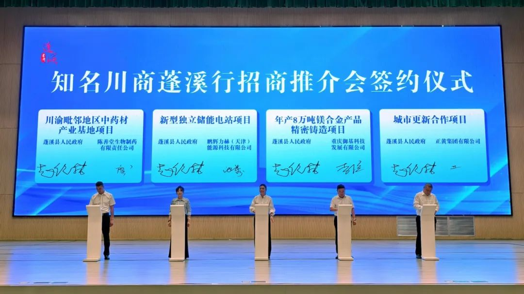 会议观看了蓬溪县招商宣传片,张淀渲作投资环境及招商项目推介。副县长赵伶莉代表蓬溪县人民政府与四川省投资促进会、四川省川商总会签订战略合作协议,与重庆御基科技发展有限公司、鹏辉力赫(天津)能源科技有限公司、正黄集团有限公司、陈善堂生物制药有限公司签订投资协议。