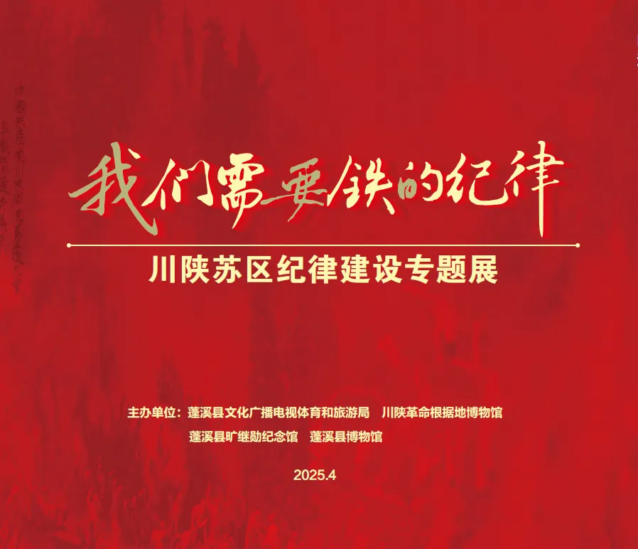 为赓续红色血脉、强化纪律教育,《“我们需要铁的纪律”川陕苏区纪律建设专题展》于4月25日在蓬溪县旷继勋纪念馆正式开展。此次展览由蓬溪县文化广电体育旅游局、川陕革命根据地博物馆、蓬溪县旷继勋纪念馆、蓬溪县博物馆共同策划推出,是深化爱国主义教育与红色廉政文化建设的重要实践。