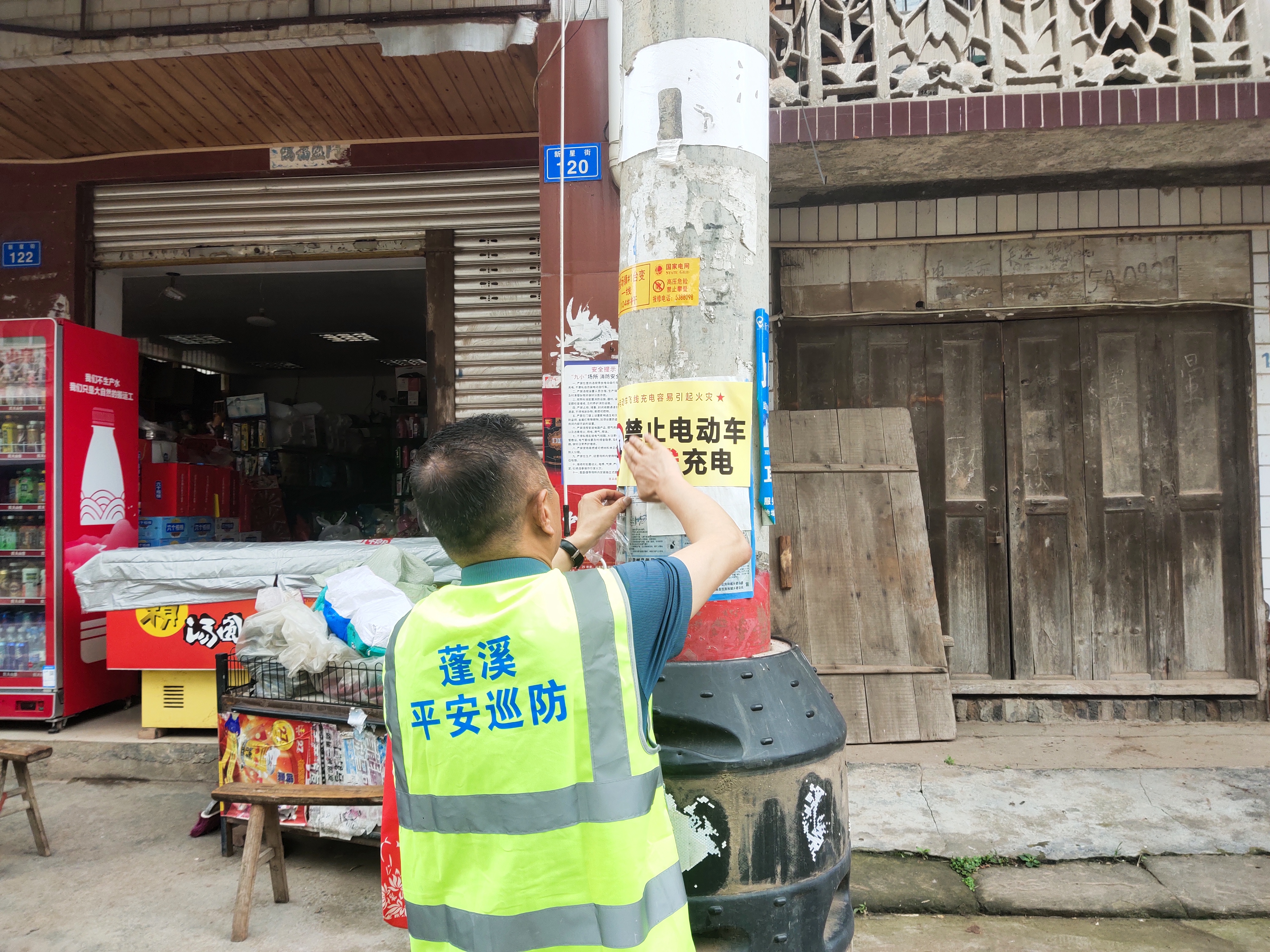 工作人员正在张贴消防通道标识
