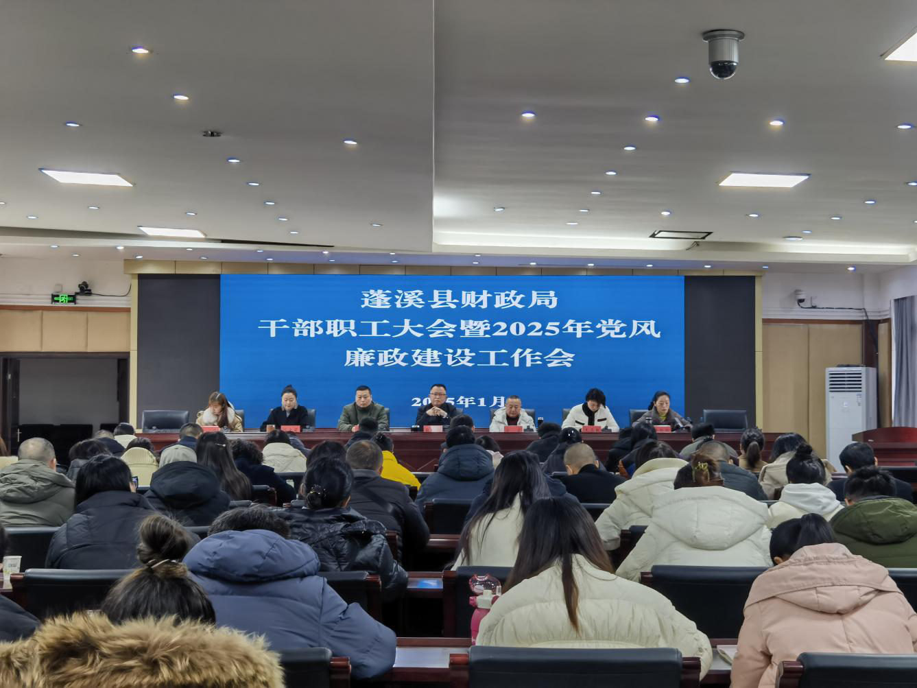 2025年1月9日上午,蓬溪县财政局召开干部职工大会暨2025年党风廉政建设工作会。会议重点围绕党风廉政常态常治、严抓严管、加强政治引领展开,敲响廉政警钟,勉励全体干部职工管好手、管好嘴、管好腿,系好廉洁第一粒扣。会议对2024年财政工作进行了总结,对2025年财政工作进行了安排部署。会议由蓬溪县财政局党组书记、局长敬世刚同志主持。