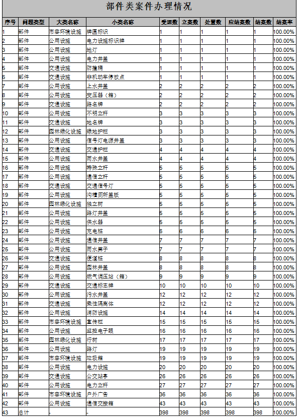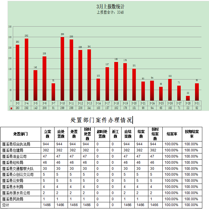蓬溪县数字城管2025年3月共上报案件3348件。其中信息采集上报1474件,视频上报9件,自行处置上报1865件。立案1466件,已处置1466件,应结案1466件,结案1466件,结案率100%,按期结案1466件,按期结案率100%。本月立案的事件类案件1068件,立案5件以上的案件种类39种,主要集中在街面秩序、市容环境、宣传广告三大类;立案的部件类案件398件,立案5件以上的案件种类27种,主要集中在公用设施、市容环境设施、交通设施三大类。