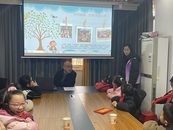 座谈会上,社区党支部书记通过PPT形式,带领大家沉浸式回顾了为期5天的“爱心蜀托”公益性假期托管服务。看着PPT上不断滚动播放的图片,少先队员们的思绪与话闸瞬间回到了过往的美好时段,社区支部书记也针对PPT中所展示的教孝台、宝梵壁画、中国红海等图片再次嵌入式的进行了一场生动的爱国、爱家及孝道传承宣讲教育。