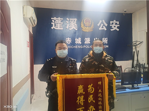 2021年11月16日晚上,一快递员为蓬溪县公安局赤城派出所民警王选妃送来一面印有“ 为民办实事 、赢得百姓心”字样的锦旗并连声道谢,感谢民警热心对待其求助,在短时间内为其找回了丢失的贵重快递。