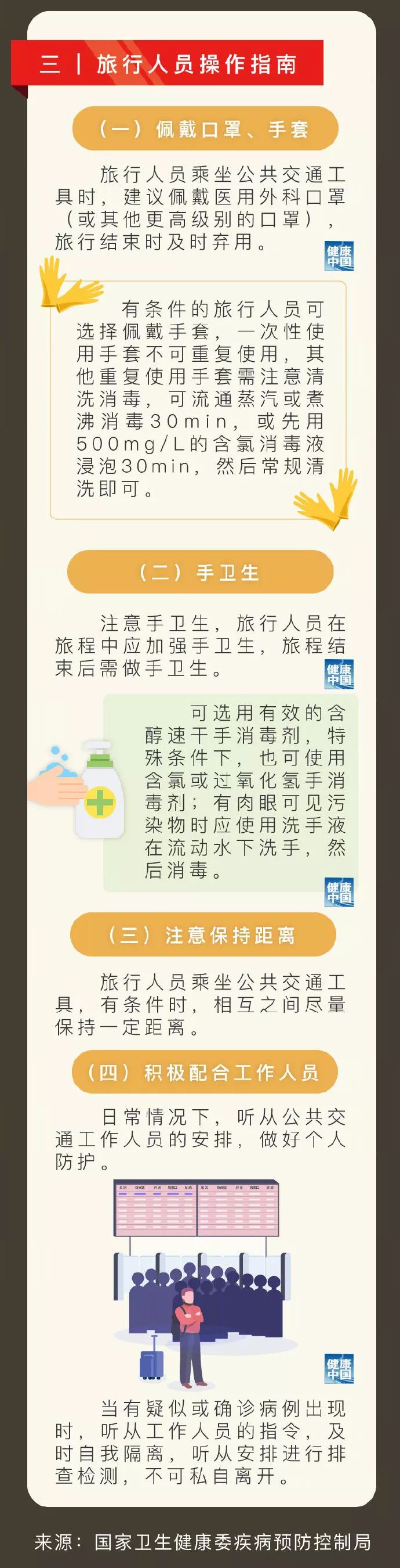 新型冠状病毒感染的肺炎流行期间,正常运行的飞机、火车、长短途客车、公交车、地铁、轮船等公共交通工具上的感染防控,工作人员、旅行人员要注意以下事项: