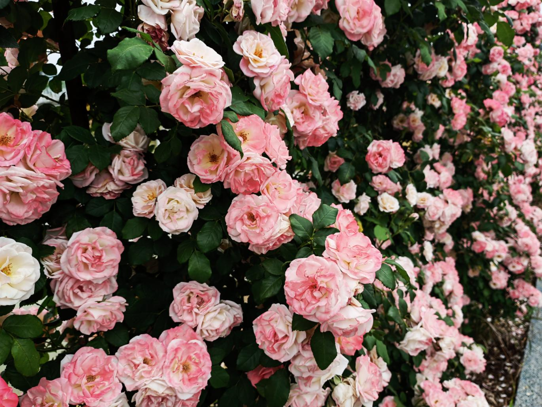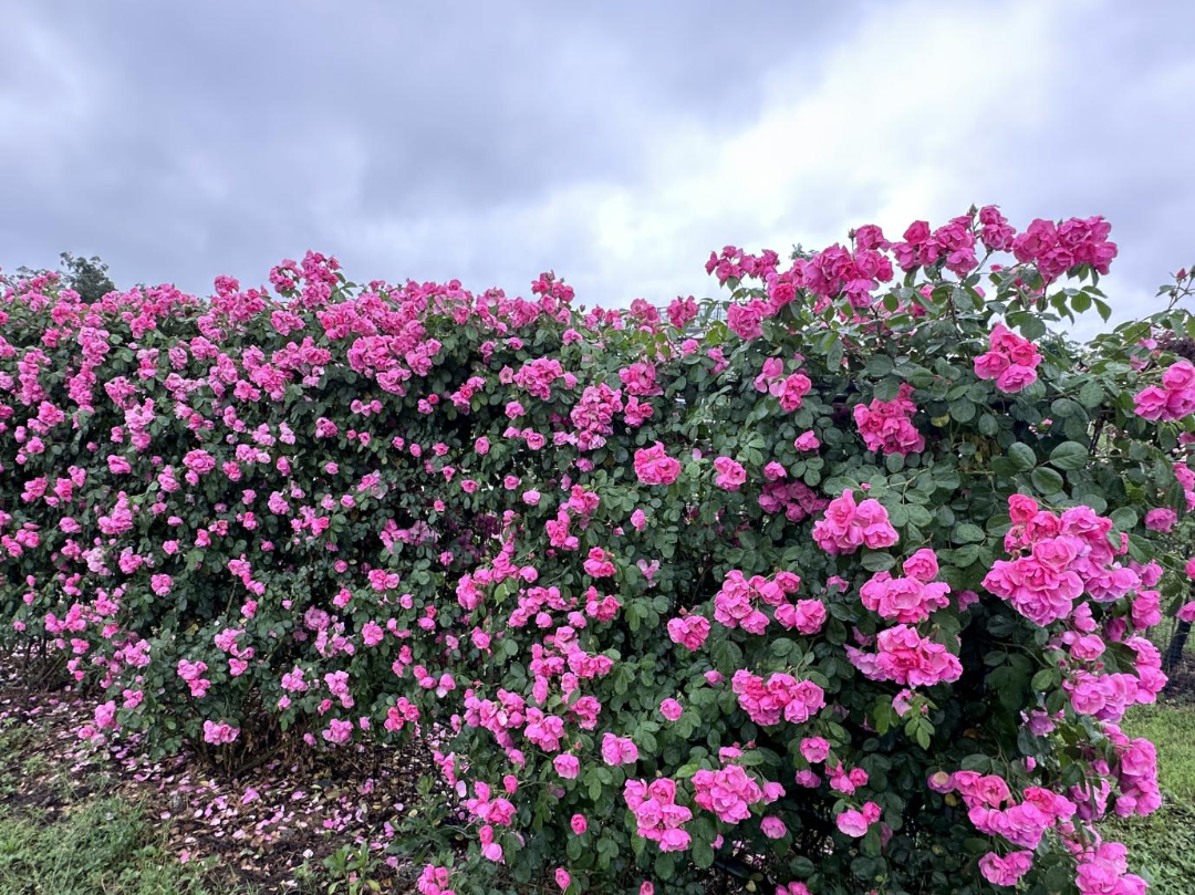 这些被精妙园艺点化的精灵,既有法兰西古典玫瑰的华贵气韵,又兼具东方月季的灵秀风骨,绛红如霞、浅粉若云、雪色似月,层层叠叠的花浪织成流动的锦绣,馥郁芬芳在空气中流淌成甜蜜的诗行,蜜蜂与凤蝶在重瓣迷宫里写下翩跹注脚,就连花廊架下的小草也浸润了玫瑰色的光阴。难道你不想来看看这犹如彩虹坠入天福万象的花海吗?