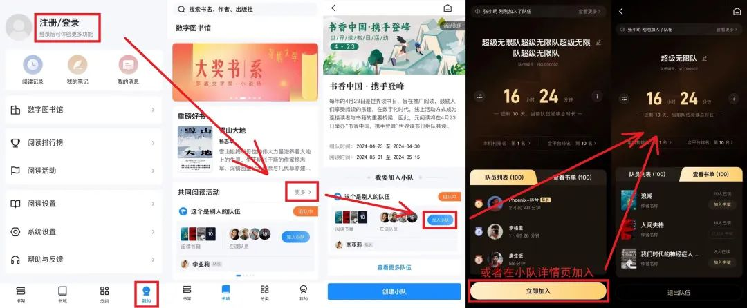 第二步,参与活动:在书城首页找到活动模块,活动开始后即可选择创建或加入小队,人数达标后即开始记录阅读时长。